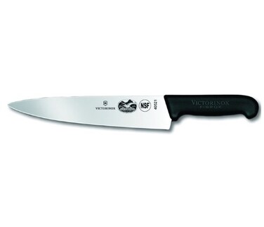 A TRUSTED FAVORITE Preferred by both home chefs and culinary professionals, the 10" Fibrox Pro Chef's Knife can handle nearly every kitchen task imaginable. Crafted with a comfortable handle, superior weight and balance, and a razor sharp edge that rarely requires re-sharpening, this knife is an essential tool for every kitchen.KEY FEATURES High-quality, lightweight European steel. Handle design reduces hand and wrist fatigue. Fit for dicing, mincing, chopping, slicing, and shredding. Long, sloping curved blade that ?rocks? for effortless mincing and chopping. Flat spine for extra power to slice through hard-skinned items. Non-slip patented Fibrox Pro handle for a secure and comfortable grip no matter the hand size. National Sanitary Foundation (NSF) approved and dishwasher safe. CARE AND USE Be good to your knives and they?ll be good to you. Following these simple guidelines will ensure that you get the longest life out of your knife!CLEANING Victorinox Swiss Army recommends washing all knives by hand. For best results, hand wash your knives with a soapy cloth and dry immediately. While Fibrox Pro knives are dishwasher safe, we recommend hand washing as dishwashers are designed to spray water at a relatively high pressure, which can jostle the silverware and cause the knives to collide, dulling the edge.SHARPENING For optimum performance, knives should be honed after every couple of uses. Proper and frequent use of a honing steel will keep your knives sharper and performing at their best.FORMERLY FORSCHNER In 1937 Victorinox began selling cutlery in America through a Connecticut distributor called R.H. Forschner & Co. A well-known manufacturer of butcher scales, Forschner soon became the exclusive U.S. distributor for Victorinox knives, and was the name by which Victorinox knives were known.