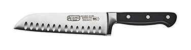 High carbon German steel, Unique solid POM handle helps with weight distribution, Triple rivet handle, 7-inch full tang steel blade, Dishwasher safe.