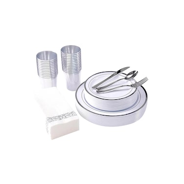 Aiwanto 175Pcs Disposable Plates Set Dinner Plate Set Wedding Party Disposable Silver Plastic Plates Set