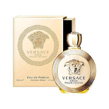 The primal power of a Female, captured in a radiant, sensual essence. A fragrance of strength, individuality and seduction. Attraction, desire, passion. Eros in a perfume. An alchemy of tempting, bright and feminine notes. A refined accord of lemon and jasmine, exalted by sensual and smooth woods. Attraction, desire, passion. Eros in a perfume. An alchemy of tempting, bright and feminine notes. A refined accord of lemon and jasmine, exalted by sensual and smooth woods. The bottle is crafted with the mythological codes of the Versace DNA. The gold Medusa, and the Greek key engraved on the edge, stamp their imposing authority on the bottle. The Greek key is repeated on the back of the bottle, with a Medusa embossed on top of the cap. The Eau de Parfum is held in a high-quality deluxe coffret, with the elegant opening of a tiroir, typical of fine jewelry.