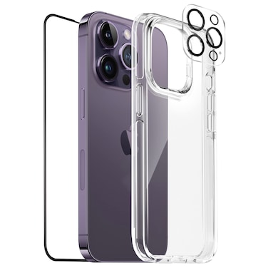 Moxedo 3 in 1 Protection Pack, Tempered Glass Screen Protector, Clear Case and Camera Lens Protector for iPhone 14 Pro