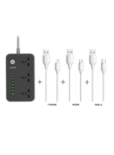 LDNIO 3-Power Socket With 6-USB And Lighting, Type-C, Micro Cables Universal Power Strip 2meter Grey/White