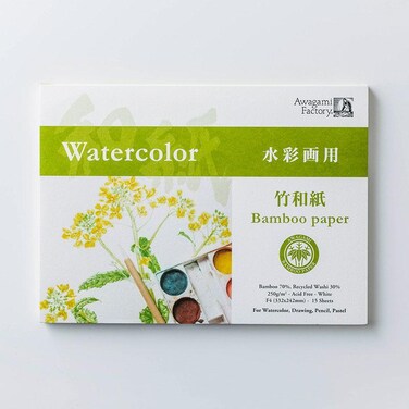 - Awagami Art Pad - Bamboo Paper for Watercolor Painting 332 x 242 mm - F4 - (15 Sheets) An eco-friendly blend of 70% bamboo + 30% recycled pulp and sized for water-based media. With its subtly textured surface, Awagami Bamboo responds beautifully to artists' brushstrokes and has less sticky sizing than EU papers - this allows for the paper's lovely surface to unify with pigment effortlessly offering artists new more organic results. 100% acid-free and made solely at Awagami, Japan. weight: 250gsm deckled edges: 0 material: 70% Bamboo / 30% Recycled Pulp ph: 6 to 7