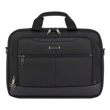 The American Tourister Bass Polyester Briefcase 02 features multiple compartments and pockets for easy organization. The adjustable shoulder strap allows for comfortable carrying, while the top handle provides a convenient carrying option.