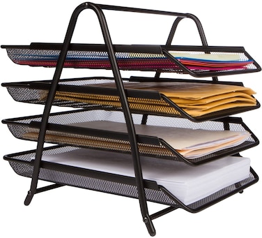 - <p>ASSEMBLES IN 5 MINUTES (L13" H12.2" W10.5") - Our black desk tray organizer is so easy to put together that even a child could do it! Our customers love simple assembly which saves them time. All it takes is three simple steps, and the included instructions tell you just what to do<p>33% MORE SPACE THAN THE COMPETITION WITH 4 SLIDING TRAYS - Our modern metal mesh rack offers 33% more space than other school and office organizers sold on Amazon! This gives you more storage space for your home & kitchen to store accessories & supplies. Why buy more than one rack when you can have 4 drawers in the same price<p>AUTOMATIC TRAYS STOPS, KEEPS FILES IN PLACE (2" GAP BETWEEN TRAYS) Our mail holder stops automatically at the back and prevents trays to slide out which helps to keep the files in place. This makes your life easier and organized. The drawer tiers won't fall off even when you lift the organizer to move from one room to another room. The holder is easier to load due to its sliding, which are spaced 2" apart. There are even rubber feet on the bottom to protect your desktop<p>OH SO STRONG, PLACE HEAVY ITEMS WITH NO PROBLEMS - Our paper sorting and storage rack has plenty of room for your documents and folders and is crafted out of metal, not plastic, to hold more weight. You can place heavy large reams of paper in the inbox and outbox trays without worry<p>Product Dimensions: <p>33.02 x 26.67 x 31.12 cm, 399.16 Grams<p>Can't figure out how you'll ever get all of your documents, file folders and letters neatly organized? This table desk folder organizer makes sorting and storing everything from correspondence to files to reams of paper easy and gives you more space for your important papers. Whether you use it at home in your office or bedroom, in your dorm or at work, the 4 tier desk organizer will eliminate clutter and make it so much easier to find mail, papers and folders. You can use it as an in and out box, a rack for printer paper, a filing system and so much more. When you choose the our 4 tier desk organizer, you'll be getting the absolute best letter tray and paper holder on amazon. Our stylish, wire organizer beats the competition because it's: -More spacious. With l13" h12.2" w10.5"" trays, our organizer is 33% larger than the competition, giving you more room to hold all of your important items. -Simpler to assemble. Follow the instructions to complete just three simple steps and get your paper holder ready for use. It only takes 5 minutes -more durable. Crafted out of heavy-duty metal mesh, not cheap plastic, our desk organizer is ultra light but stronger than other organizers on the market. -Easier to load. The front load design keeps paper easily accessible and each tray slides in and out for your convenience.