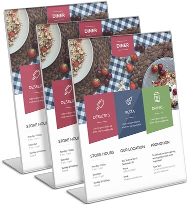 - <p>HIGH VISIBILITY THICKENED 3MM DURABLE CLEAR ACRYLIC: Crystal clear sign holder is slanted for easy reading. Updated extra 3mm thick acrylic is shatter resistant, has long-lasting strength, and will stand up to extended use for years to come<p>SIMPLE AND EFFECTIVE: Slanted sign holder is easy to use and maintain. Side loading opening for quick and simple switching of new contents. When dirty, just use a damp cloth to wipe clean and it'll look brand new<p>VERSATILE SIZE DESIGN: Holds the perfect sizes of paper for displaying menus, drink specials, important announcements, photos and much more. Able to hold up to A4 sizes with slight fold or crop. Not only does the stand hold in portrait mode but can also hold papers in landscape perfectly<p>PROTECTED PACKAGING AND SHIPPING: 3 pc Slanted Back Acrylic Sign Holder Stand is mindfully packaged with its own box and protective film over each stand to prevent damage or scratches during shipping. Ensuring you receive the best product for display<p>Product Dimensions: <p>30.48 x 22.99 x 9.3 cm, 1.2 Kilograms<p>Advertising is expensive nowadays, why not make use of the space you have and advertise to people that's already there!Promote your goods and services with a Slanted Back Acrylic Self Standing Sign Holder. Self-standing for placing on any flat surface, no need for mounting hardware and allows for easy reading through the crystal clear acrylic plastic construction. This acrylic slanted sign holder is the perfect 8.5 in x 11 size holding papers, cards, photo, picture, poster, brochure, menu, schedule, children's arts, list, image, advertisement and regulation at restaurant, office, business convention, store, church, home, hospital, restrooms, school, charity, auction, and trade show events.Specification:Color: ClearMaterial: Premium Grade AcrylicSize: 8.5in x 11in (21.6cm x 27.94cm)Thickness: 3mmEasy Slip InsertsSolid Back BaseSelf Standing Vertical Portrait Display also is self-standing in landscape setupPackage Content:3 x Slanted Back Acrylic Sign Holder Stand, Ad frames Clear Acrylic Plastic Flyer Display 8.5 x 11 Inches Tabletop Menu Presentation Sheet Holders Perfect for Home, Office, Store, Restaurant, Photo