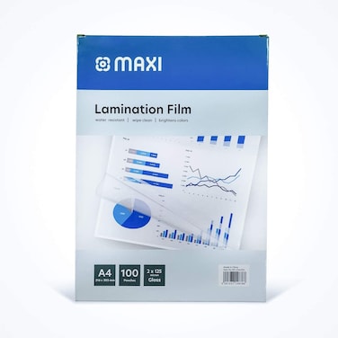 - <p>A4 Lamination Pouch (216x303mm)<p>Suitable For All Types Of Lamination Machine<p>Water Resistant<p>Wipe Clean,Brightens colous<p>Product Dimensions: <p>22 x 30.7 x 2.5 cm, 1.68 Kilograms<p>Maxi Lamination Film A4 100 sheets Superior quality 125mic x 2 lamination film,