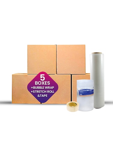 5 Pack of cardboard boxes, 1 roll of bubble wrap, 1 packing tape, 1Stretch Film