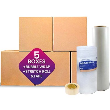 5 Pack of cardboard boxes, 1 roll of bubble wrap, 1 packing tape, 1Stretch Film