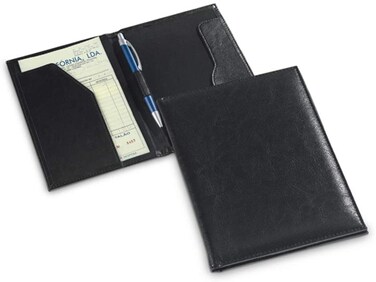 - Bill holder. Imitation leather. Ball pen not included. 125 x 181 x 7 mm</br></br><li>PU Leatherette bill holder<li>Size about 12.5 x 18.1 x 0.7 cm<li>Ideal for small restaurant, coffee shop using