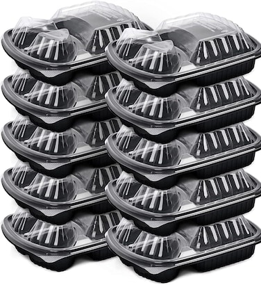 Go2Camps Alsaqer [20 Pack] 3 Section Black Base With Lids Food Storage Container, Disposable Food Container , Meal Preparation Containers , Lunch Boxes Microwave , Freezer Safe (3 Compartment)