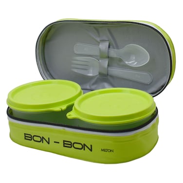 The Milton Bon Bon Soft Line Lunch Box Set Green includes two lunch boxes, each with a capacity of 280ml.
