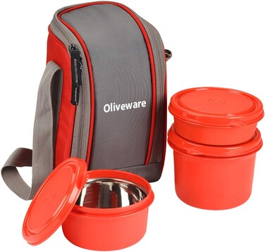 Oliveware Boss Lunch Box - Red Steel Range Microwave Safe & Leak Proof 3 Air-Tight Containers with Bag Keep Food Hot School, College & Office Use