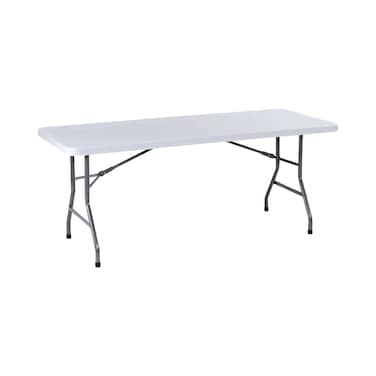 - Compact folding table, constructed of smooth roll-up aluminium slat top and sturdy steel support