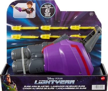 Stranded on an uncharted planet, Buzz Lightyear and his crewmates will need to battle hostile plants, giant bugs and the ultimate threat, Zurg, to complete their mission and return home. Inspired by the thrilling animated adventure, Disney and Pixar's Lightyear, this Blaster is an exciting battling toy for fans who can indulge in good versus evil play by posing as the fearsome Zurg! The purple and red toy lets fans recreate all the action and conflict from the movie, putting themselves in an intimidating character role! The three projectiles load into the back of the blaster, then pulling the spring-loaded handle releases a triple assault with projectiles shooting all at once, traveling up to 10 feet! Other Lightyear role play items are available, each sold separately and subject to availability. Let the imagination soar! Colors, dimensions and decorations may vary.
