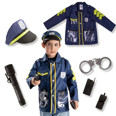 Kidwala police man costume dress up set, blue jacket & blue hat police man officer outfit with realistic tool accessories walkie talkie,Cuffs & gun worker tools educational costume for boys & girls