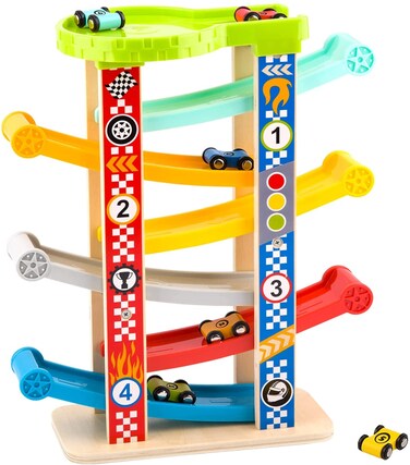 Quality and safety - Toddler ramp track toy is made of high-quality wood, smooth edge, BPA-free, and coated with bright non-toxic water-based paint. The wheel cannot be pulled out without violent damage. Don't worry about the wheels falling off or the pieces scattered.