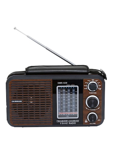 Listen to your favorite songs with Olsenmark\'s FM/AM/SW Radio and USB/SD/BT Music Player. The radio has been designed in a vintage style in black and brown. It is sure to enhance your interiors and create your own style statement with this timeless piece. The radio has versatile functions, which rank it highly. The functions include AM/FM/SW/USB, music player, Bluetooth connectivity, MP3 player, built-in rechargeable battery, etc. With the Bluetooth function, you can connect your Bluetooth-enabled smartphone, tablet, or computer to stream unlimited music directly without wires. You can easily tune in to any local radio station using simple yet easy-to-use buttons. In addition, the radio features an 8-band radio with FM, AM, and SW. The multi-functional radio additionally has other features such as an AUX IN jack, a DC 1.5V IN jack, a USB port, and an MP3 player for ease of playing music using other devices. The radio has a built-in, high-capacity rechargeable lithium battery. The portable and lightweight design makes it easy to carry around and listen to music whenever you like, which makes it ideal for picnics, parties, barbecues, and more. The radio weighs only 1.056 kg and comes with a 2-year manufacturer\'s warranty."'
