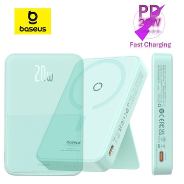 Baseus 5000 mAh Battery Pack For Magsafe 5000mAh Wireless Portable Charger PD 20W Fast Charging With Stand And USB C On The Side Magnetic Power Bank For iPhone 15 14 13 12 Pro Pro Max Plus Mint Blue