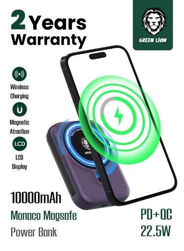 Green Lion 10000mAh Monaco Magsafe Power Bank 22.5W PD+QC, Magnetic Attraction, LCD Display, Integrated Lightning Cable Compatible With MagSafe For iPhone 14/13/12 Series - Purple