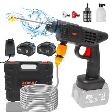 Introducing the groundbreaking 88V Cordless Portable Washer - your all-in-one solution for uncompromising cleaning power. With an astonishing 22Bar (870psi) pressure and a rated water flow of 4L/Min, this innovative washer offers a remarkable 2X more power compared to standard garden hoses with nozzles. Engineered to deliver superior performance, it's the ideal companion for tasks like car washing, glass cleaning, and garden watering. Say goodbye to the limitations of traditional cleaning methods. Thanks to the included 5M long garden hose, this portable powerhouse can draw water from virtually anywhere – whether it's a nearby pool, a refreshing lake, a handy bucket, or your household garden hose. This unmatched versatility ensures you're never tied to a single water source, making every cleaning session a breeze. Powered by a reliable 88V lithium battery, this washer boasts an impressive battery life, granting you the freedom to clean without the hassle of wires or outlets. Its lightweight and compact design makes it easy to maneuver, allowing you to reach tight spaces effortlessly. The plug-and-play functionality ensures you're up and running in seconds, ready to tackle any cleaning challenge that comes your way. The package includes convenient accessories that enhance your cleaning experience. The foam pot attachment simplifies washing, giving you a thorough cleanse for your vehicles or other surfaces. Meanwhile, the high-efficiency filtration box for the hose guarantees that the water used is free from impurities, safeguarding the longevity of the pump and ensuring consistent, reliable performance over time. Equipped with two specialized pressure nozzles, this washer covers all your cleaning needs. The 0° nozzle delivers a concentrated, forceful stream, perfect for giving your car a pristine rinse or efficiently watering your garden. The 40° nozzle, on the other hand, provides a broader spray pattern, making it the ultimate tool for quick and effective cars
