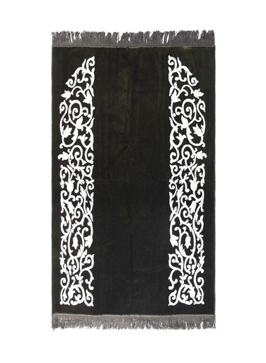 From the pinnacle of Islam, motifs on the black mat are embroidered in a splendid harmony that provides a constant remembrance of the Door of Kaaba. Beautifully crafted in warm colors that illustrate its luxury and elegance. This prayer mat brings you back to re-live the spiritual moments wherever you are. We introduce, A soft and elegant Dodhia Polyster Treated Heat set rug featuring an intricate pattern and beautiful arch! Made in KSA.