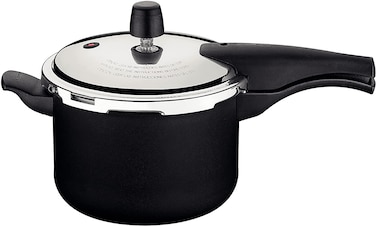 Color:BlackTramontina - Pressure Cooker 20 cm 4.50 Lts Vancouver, 4 Safety Valves and Locking system, Internal/External Non-Stick Coating. MATERIAL: 3.2 mm thick aluminum body for faster and more uniform cooking. Interior and exterior Starflon Max non-stick coating, easy to clean, more durable and keeps your cooking healthful. Lid with exterior polished aluminum finish and a satin interior finish. Heat-resistant Bakelite handles for increased safety during use.