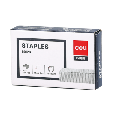- <li>Specification : Staples - 26/6<li>Material : Zinc plated wire iron material<li>Packaging : 100pcs/row, 1000 pcs per box, 20box/ display box, 400box/carton<li>Spec. 1 : Staple up to 30 sheets(70gsm)<li>Spec. 2 : Engraved logo on staples (deli logo)<li>Color : Silver<li>Contains Pack of 1x1000x20