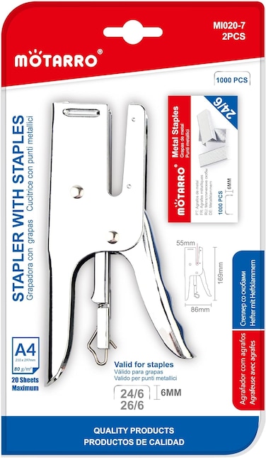 - <p><bi>Brand Motarro <p><bi>Item name: Metal Plier Stapler <p><bi>Number of pieces 1pcs <p><bi>Model No: MI020-7 <p><bi>Ink colour Silver