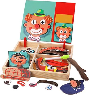 Kids Creative Magnetic Play Set for Making Clown Faces using different set of face parts eyes, nose, mouth and hair and caps. write or draw with the marker pen, and after playing, kids can simply put the pieces back in the box and close the lid, easy storage. there are magnetic pieces and 12 instruction cards . kids can create different face refer to instruction cards or get stuck with his own ideas for puzzle designs, and they can also write or draw with the marker pen, help kids explore their imagination.