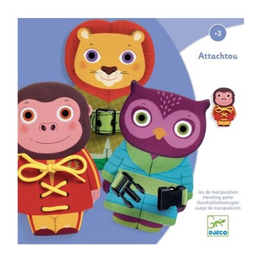 3 different manipulations: Lace for learning to tie simple knots, 1 metal belt buckle, 1 plastic belt clip. Learning the gestures of everyday life. Three boards in the shape of animals: a lion, a monkey and an owl.