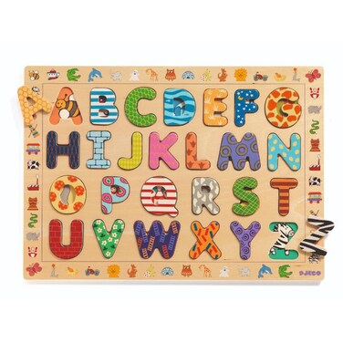 This large wooden tray (42 x 30 cm) with 26 pieces represents the alphabet letters from A to Z. Each letter is decorated with an animal or an object (the Zebra for the Z, the Factory for the U or the Wagon for the W) allowing to associate a word.