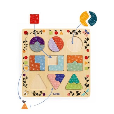 A wooden puzzle featuring 3 different shapes, each shape has 2 pieces with the pairs having a matching motive.