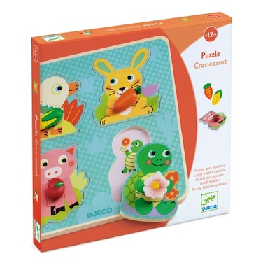 A wonderfully colourful 4 piece wooden lift out puzzle. The animals are brightly coloured with chunky buttons to hold so they can be taken out and placed back by little hands.