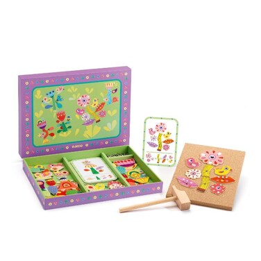 Includes 1 cork board, a hammer, 5 instruction cards, 40 pegs and 39 wooden garden shapes!