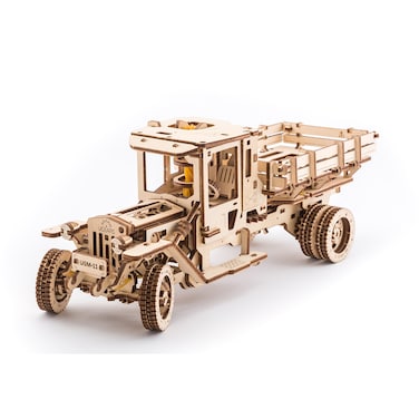 - UGEARS creates eye-catching and imaginative self-propelled wooden mechanical model kits that can be assembled without glue. Their designs are inspired by real-life mechanisms and embody love of art and ingenuity. UGEARS believes that building these beautiful working models should be a fun, engaging and rewarding experience for the whole family. In this world of video games and virtual reality, people still get excited when they find creative and fulfilling ways to use their hands. UGEARS fuels this excitement and gives individuals and families the opportunity to come together through the joy of hands-on modeling. UGM-11 Truck represents a new generation of our mechanical models. This is the model that could take more than one hour to complete, but the rewards are absolutely worth the effort for the fans of mechanics. The model is equipped with a four-cylinder engine, which is driven by the crankshaft, which in turn is powered by fully-functional drive shaft turned by a rubber band engine via a system of gears. The Truck is what we call 100% rubberpunk, which means clockwork and steam punk worlds blended perfectly. A gear change lever on the side of the truck allows for three modes – forward, backward and idle. The rubber band engine winds up with a lever mechanism conveniently placed on top of the Truck’s cabin. ‘Start’ the engine in idle mode and see four pistons moving realistically under the folding hood. Open the cabin door and observe the fully functioning steering wheel connected via a steering column to the front wheels suspension. There’s even a working gas pedal! We deliberately designed this model to have a raw, open look to it, so the spectators could appreciate the sophistication of the feature-packed mechanism. • NO GLUE CONNECTION - Assembling without glue and chemicals • SELF ASSEMBLY - Details are already cut and ready to assemble • MECHANICAL - The model produce motion • EDUCATIONAL - Perfect for family projects through hands-on STEM learning • TYPE OF PRODUCT - Mechanical Model • MATERIAL - Plywood, Rubber • MODEL SIZE - 13.3 x 4.7 x 4.9 inch (34 x 12 x 12 cm) • PACKAGING SIZE - 14.6 x 6.7 x 1.5 inch (37 x 17 x 4 cm) • PACKAGING WEIGHT: 1.226 Kg • NUMBER OF COMPONENTS - 420 parts • ESTIMATED TIME FOR ASSEMBLY - 10-12 hours • WARNING - Not suitable for children under 14 years • CAUTION - Contains sharp parts • MADE IN: Ukraine
