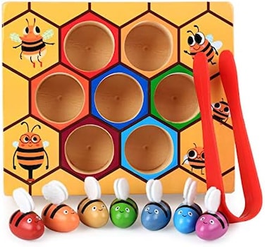 A toddler's first puzzle. Easy for a toddler to understand and grasp the correct idea, match the colored bee to the corresponding colored slot in the honeycomb. This activity board is also great for learning to recognize and match colors.