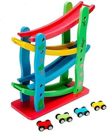 - With its sturdy wooden ramps and vibrant colors, this race track set sparks creativity and encourages storytelling.