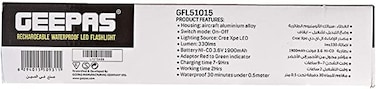 - <p>Brand: Geepas<p>Color: Multi Color<p>With Speakers: No<p>Type: Handheld Flashlights<p>Bulb Type: LED<p>Number of Modes: 1<p>Batteries Included: No<p>Water Resistant: Yes<p>Lumen: 100 - 499 Lumens<p>Charging Time: 7 Hours<p>Lumen: 330 lm<p>Battery Power: 1900 mAh<p>Item Number: 1532347<p>EAN-13: 6294015509311