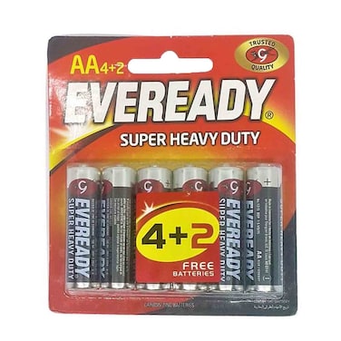 Power up your devices with the Eveready Super Heavy Duty AA Battery R6 1.5V Black 6 PCS. These reliable batteries are perfect for everyday use in a variety of devices, from remote controls to toys.