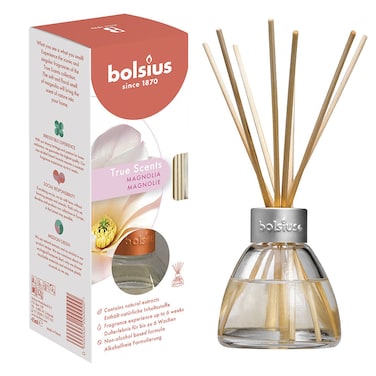 Palm Oil Free. alcohol-free. With wooden sticks What you see is what you smell with Bolsius. From all time favorite classics to new trendy scents: the Bolsius True Scents collection offers a fragrance for everyone. Do you like our creamy vanilla, the musky magnolia, the lux oud wood, or the fruity pomegranate? These fragrances will help you bring nature into your home in the purest and eco-friendliest way. Guess what? Bolsius fragrances are made of natural extracts and are Palm Oil Free. So you can expect the usual high quality Bolsius standard in each one of these diffusers. The principle of reed diffusers is simple: reed sticks stand in a small, elegant bottle containing scented liquid. The sticks naturally absorb the liquid and then diffuse a wonderful fragrance into your interior. The scented liquid is not alcohol-based and is safe to use. Enjoy a delicate fragrance for up to 6 weeks. Discover the Magnolia fragrance. An absolute classic! With the soft fragrance of magnolia, white flowers and a hint of musk, you'll be imagining yourself in a field of flowers on a lovely summer's eve. Material: Liquid Fragrance, Glass Wood Dimensions: 45ml - 170 x 60mm Color: Transparent Origin: The Netherlands