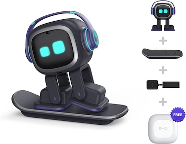 EMO: The Coolest AI Desktop Pet with Personality and Ideas. Built with multiple sensors and cutting-edge techs, Emo Robot is a cool desktop AI robot pet with characters that can self-explore the world and react to you with 1000+ faces and movements. Like a loyal companion, Emo Robot cheers you up with music, dance movements, and online games! Emo robot is also a great helper that wakes you up, turns on the light, takes pictures and answers to your questions, for a truly life-like pet on your desktop! Independently Cognitive and Curious
