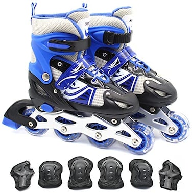 EASY FUTURE Inline Skates Adjustable Size Roller Skates with Flashing Wheels Children Skate Shoes Including Protective Gear Knee Elbow Wrist Blue Large (39-42)