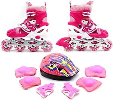 Color classification red blue pink black Package Including Full Helmet and Protective Gear Set Knee Elbow Wrist Wheel device Inline skates Applicable objects Male Female Child Shoe sizeThe size of the shoes is easy to adjust S number 3134 . M number 3538 . L number 3942 Wheel material high elastic wearresistant PU wheel Material PVC MUST KNOW BEFORE USING 1 Check that the wheels and moving parts are tight before use. If it is loose tighten it before use to ensure that there are no problems. 2 Regularly replace the brakes and ball bearings. 3 Children and young children must be accompanied by an adult. Wear Helmet and Protective Gear wrist arm and knee protection.before use to avoid accidents. 4 Avoid using on sidewalks streets or main roads to avoid injury to pedestrians and surrounding users. 5Keep control when skating. 6There is no towing vehicle. MUST KNOW BEFORE BUY 1 Manual measurement of the product the error is small. Please refer to the actual size. 2 The photo was taken under natural light because there is a slight color difference between the device and the display please understand.