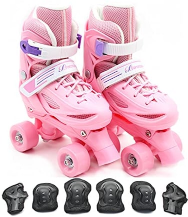 Product description Color classification red blue pink Package Including Protective Gear Knee Elbow Wrist Wheel device Double Row 4 Wheel Applicable objects Male Female Child Shoe sizeThe size of the shoes is easy to adjust XS number 2730 . S number 3134 . M number 3538 Wheel material high elastic wearresistant PU wheel Material PVC MUST KNOW BEFORE USING 1 Check that the wheels and moving parts are tight before use. If it is loose tighten it before use to ensure that there are no problems. 2 Regularly replace the brakes and ball bearings. 3 Children and young children must be accompanied by an adult. Wear Helmet and Protective Gear wrist arm and knee protection.before use to avoid accidents. 4 Avoid using on sidewalks streets or main roads to avoid injury to pedestrians and surrounding users. 5Keep control when skating. 6There is no towing vehicle. MUST KNOW BEFORE BUY 1 Manual measurement of the product the error is small. Please refer to the actual size. 2 The photo was taken under natural light because there is a slight color difference between the device and the display please understand.