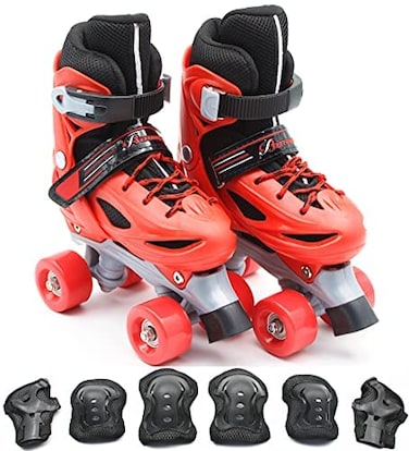 Product description Color classification red blue pink Package Including Protective Gear Knee Elbow Wrist Wheel device Double Row 4 Wheel Applicable objects Male Female Child Shoe sizeThe size of the shoes is easy to adjust XS number 2730 . S number 3134 . M number 3538 Wheel material high elastic wearresistant PU wheel Material PVC MUST KNOW BEFORE USING 1 Check that the wheels and moving parts are tight before use. If it is loose tighten it before use to ensure that there are no problems. 2 Regularly replace the brakes and ball bearings. 3 Children and young children must be accompanied by an adult. Wear Helmet and Protective Gear wrist arm and knee protection.before use to avoid accidents. 4 Avoid using on sidewalks streets or main roads to avoid injury to pedestrians and surrounding users. 5Keep control when skating. 6There is no towing vehicle. MUST KNOW BEFORE BUY 1 Manual measurement of the product the error is small. Please refer to the actual size. 2 The photo was taken under natural light because there is a slight color difference between the device and the display please understand.