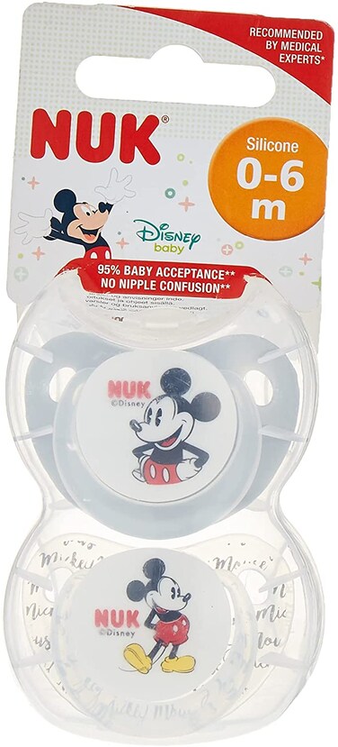 Pack contains 2x NUK orthodontic silicone soothers (Mickey and Minnie Mouse), Comes with a flat button ideal for use when sleeping, For babies aged 0-6 months, BPA-free, Comes in a sturdy, reusable storage case