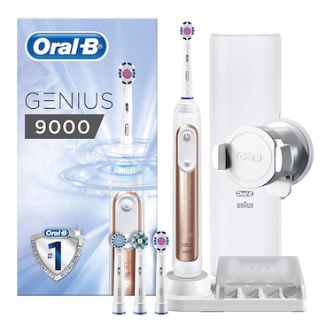 The Oral-B GENIUS 9000 Rose Gold – the first Oral-B intelligent brushing system with new Gum Guard technology to help you brush like your dentist recommends. Thanks to the unique Position Detection technology you will never miss a zone. With the round brush head you can remove up to 100% more plaque than with a standard manual toothbrush. The result? Healthier gums and a whiter smile by removing surface stains, starting from the first day of brushing. This beautifully advanced toothbrush protects your delicate gums and helps prevent from future issues: the combination of the new revolutionary Gum Guard technology, 360 SmartRing and Pressure Control alert you to reduce speed when you brush too hard and tell you where you over brush for a gentler routine. Last, but not least, GENIUS 9000 Rose Gold comes with a lithium-ion battery that lasts more than 2 weeks with 1 full charge. No wonder Oral-B is the #1 recommended brand by dentists worldwide. Comes with a UK 2-pin plug. Oral-B GENIUS 9000 Rose Gold electric rechargeable toothbrush is compatible with the following Oral-B toothbrush heads: CrossAction, 3D White, Sensi UltraThin, Sensitive Clean, Precision Clean, FlossAction, TriZone, Dual Clean, Power Tip, Ortho Care.Genius, the best toothbrush from Oral-B, the #1 dentist recommended brand worldwideUp to 100% healthier gums and more plaque removal: Round head cleans better100% brushing coverage: the only brush with position detection to never miss a zoneProtect your gums by knowing when and where you brush too hard with new Gum Guard technology and its pressure control sensorGently whitens your teeth starting from day 1 by removing surface stainsNever run out of battery: dual charging travel case charges both your toothbrush and phone with 1 plug6 brushing modes including PRO Clean, whitening, gum care & sensitiveContent: 1 Rose Gold handle, 4 brush heads, Lithium Ion Battery, USB Travel Case, Smartphone Holder