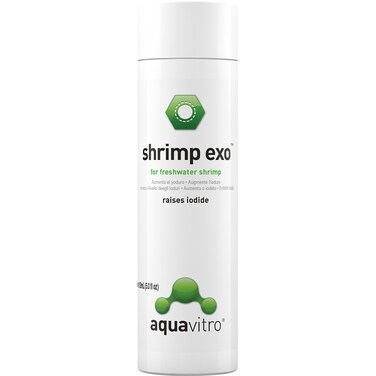 Aquavitro Shrimp Exo is a stabilized potassium iodide source intended to aid in replicating the ideal environment for freshwater shrimp. KEY FEATURES: Premium AquaVitro line Raises iodide Safe and easy to use Aids in replicating ideal environment of freshwater shrimp DIRECTIONS: Add 5mL (1 tsp) per every 40L (10 US gallons) every two weeks to maintain correct iodide levels for freshwater shrimp. If using with humate soils, dose once a week. This dose will raise iodide by 0.006 mg/L. Do not overdose this product. It is recommended to wait at least 2 weeks before using on newly purchased shrimp. *Not to be sold online.