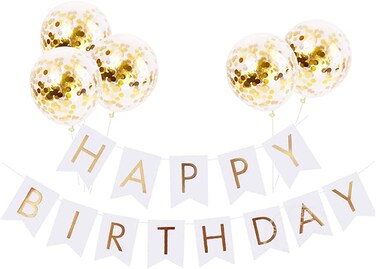 Party Time Birthday Decorations, White and Golden Premium Quality Happy Birthday Banners with Gold Confetti Balloons, Reusable Birthday Party Supplies Perfect for Kids Girls and Adults
